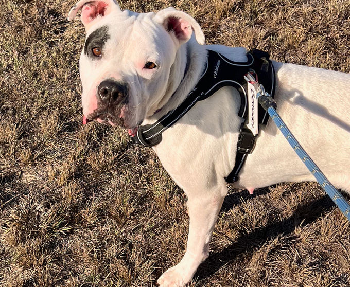 Bernie also absolutely loves going on walks. Whether it's a casual stroll around the block or a longer adventure, Bernie is always ready to hit the pavement with her favorite human. Walks are where Bernie really shines, trotting along with that classic bully breed wiggle and stopping to investigate all the good smells.